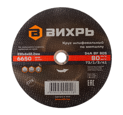 Круг шлифовальный по металлу Вихрь 230х6х22,2 мм