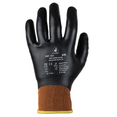 JETA SAFETY JNF-101 Ultra – защитные трикотажные перчатки с полным пенонитриловым покрытием. Полиэфирная основа перчатки изготовлена по технологии 15 класса вязки, что означает особо плотно вязку. Перчатки водонепроницаемы и отлично защищают руки от воздействия нефтепродуктов и других видов загрязнений. Плотная манжета хорошо прилегает к запястью и фиксирует изделие на руке. Модель универсальна и может применяться в различных видах работ, в том числе связанных с повышенным количеством загрязнений, влаги и воды, работ с маслами, смазками и нефтепродуктами в ограниченном количестве. Эксплуатируются на сборочно-монтажных работах, строительно-конструкторских, столярных, машиностроительных, транспортировочных, складских и ремонтных работах.