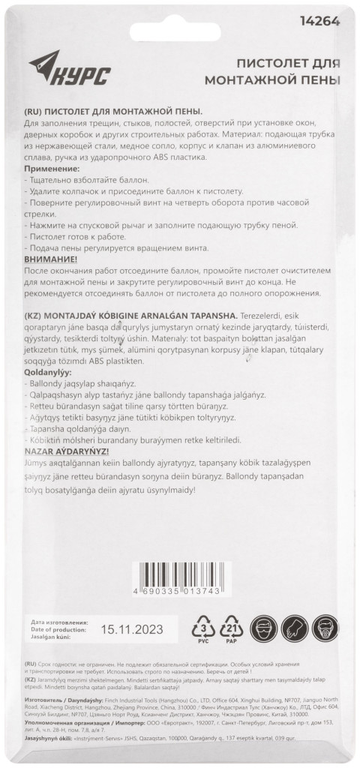 Пистолет для монтажной пены, алюминиевый корпус, КУРС 14264