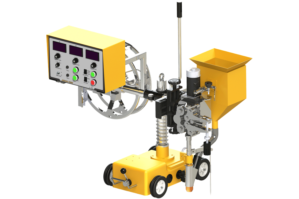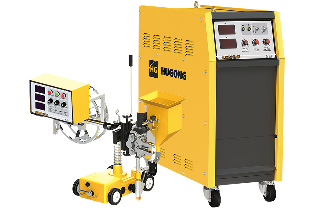 Сварочный аппарат для автоматической сварки под флюсом HUGONG ARMADA 1000N состоит из источника сварочного тока инверторного типа и 4х колесной самоходной тележки, с расположенными на ней сварочной горелкой, механизмом подачи сварочной проволоки, пультом управления, катушкой для сварочной проволоки.