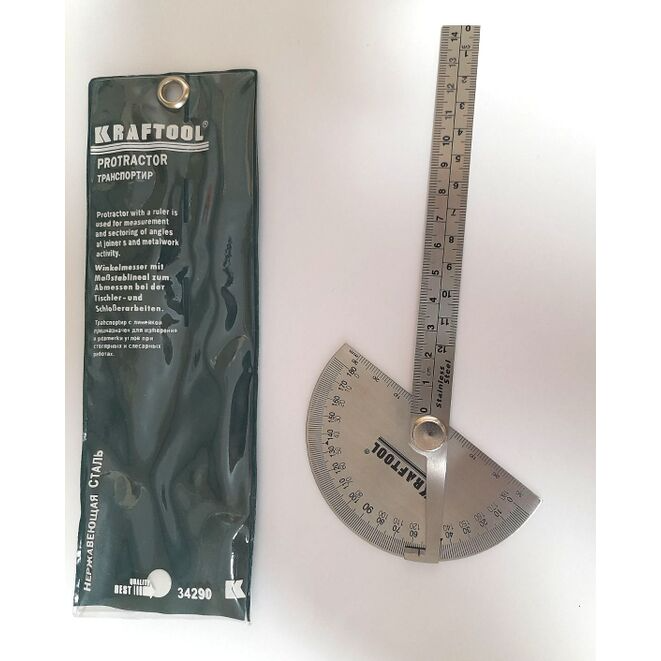 Купить Транспортир с линейкой KRAFTOOL Protractor из нержавеющей стали, 145 мм (34290) с доставкой во Владимирской области и России в компании «ВПГ».